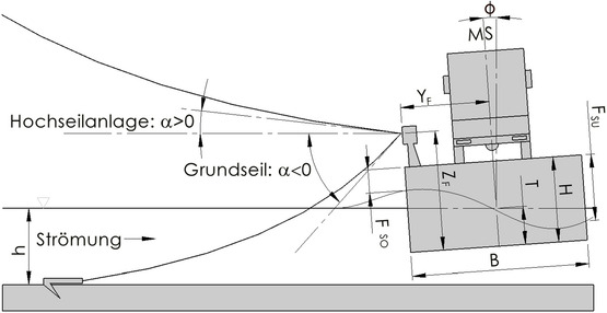 - ∝ist positiv wie gezeichnet, negativ, wenn das Seil zum Gewässergrund führt.