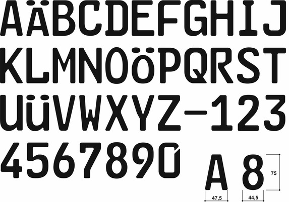 - abweichende Schrift für Kennzeichen der Bundeswehr sowie für Versicherungskennzeichen:Soweit sich aus dieser Verordnung nichts anderes ergibt, erfolgt die Beschriftung nach dem anliegenden Schriftmuster der Normvorschrift DIN 1451-2:1986-02 (Verkehrsschrift) (nach dem Hilfsnetz hergestellt), und zwar grundsätzlich für Buchstaben und Zahlen in Mittelschrift. Reicht die vorgesehene Höchstlänge des Kennzeichens hierfür nicht aus oder lässt die etwa vorgeschriebene oder die vom Hersteller vorgesehene Anbringungsstelle für Kennzeichen dies nicht zu, so darf fette Engschrift verwendet werden. Bei Umlauten darf die vorgesehene Schrifthöhe nicht überschritten werden. Der waagerechte Abstand der Beschriftung einschließlich Plaketten zum schwarzen, blauen oder grünen Rand muss auf beiden Seiten gleich sein.